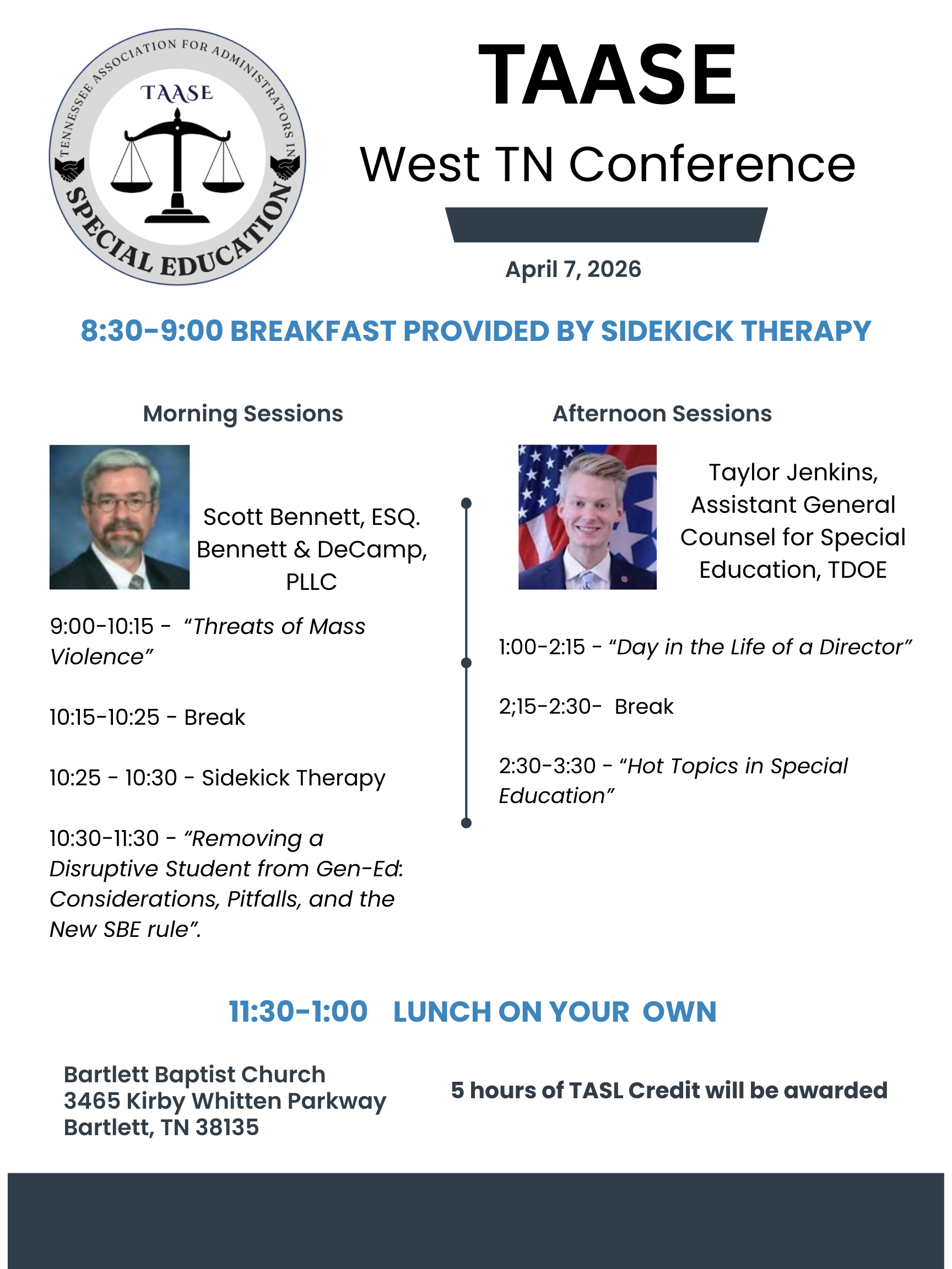 The Tennessee Association for Administrators in Special Education serves special education directors, supervisors, and other special education administrators throughout the state. TAASE does this by keeping its membership current on legislation impacting special education and by hosting an annual legal issues conference each December. TAASE membership is restricted to educational professionals who have administrative or supervisory responsibilities for programs for students with disabilities.